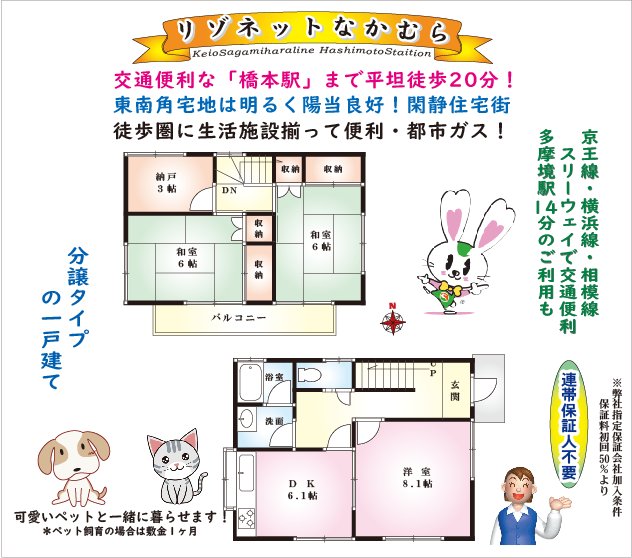 №5 京王相模原線・横浜線「橋本駅」徒歩10分 大型3SLDK一戸建て貸家
