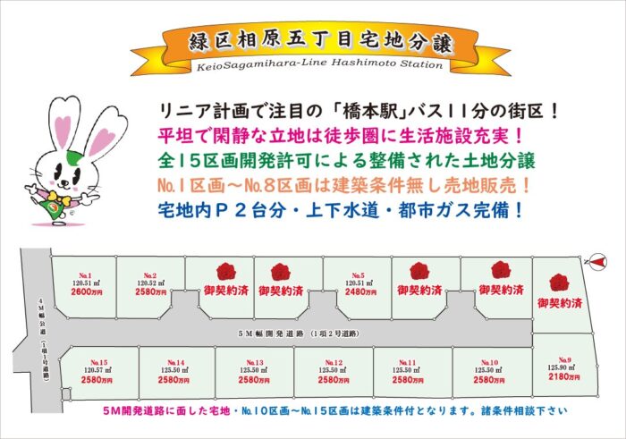 リニア新幹線神奈川県駅計画で注目の「橋本駅」バス11分の平坦で閑静な住宅街に全15区画の開発宅地分譲です。宅地120.50㎡(36.45坪)~120.51㎡(36.45坪)宅地造成済み了!宅地内上下水道&都市ガス完備。№1区画~№8区画は建築条件無し売地販売となります。お求め易い2,480万円~2,600万円 お好みの建築会社・ハウスメーカーでマイホームをどうぞ!№3区画御契約となりました。