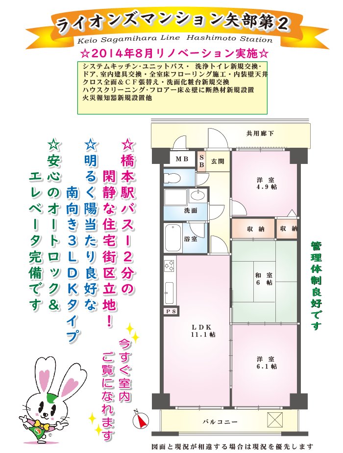 ライオンズマンション矢部第2南向き3LDK!