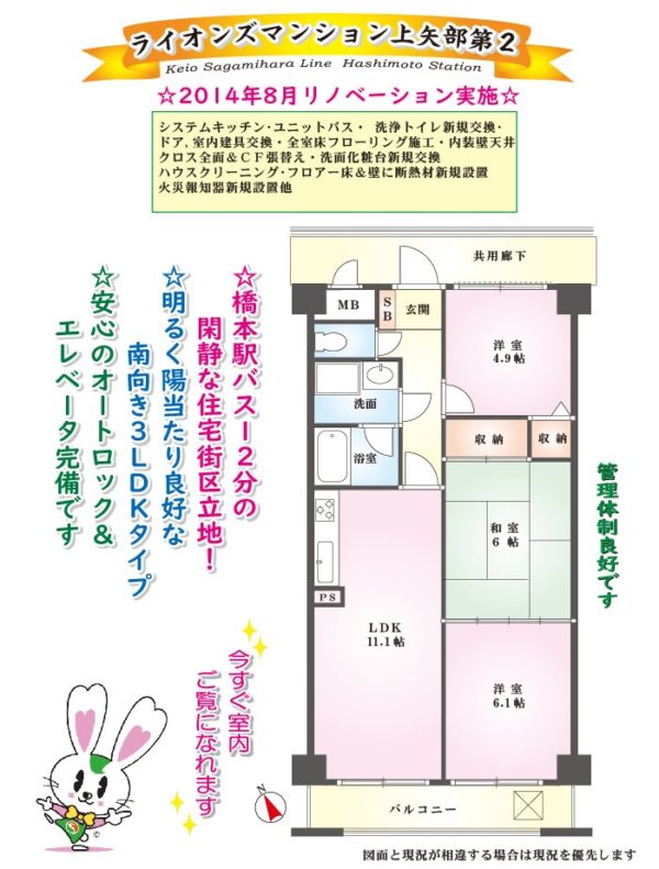 新着!ライオンズマンション矢部第2南向き3LDK!