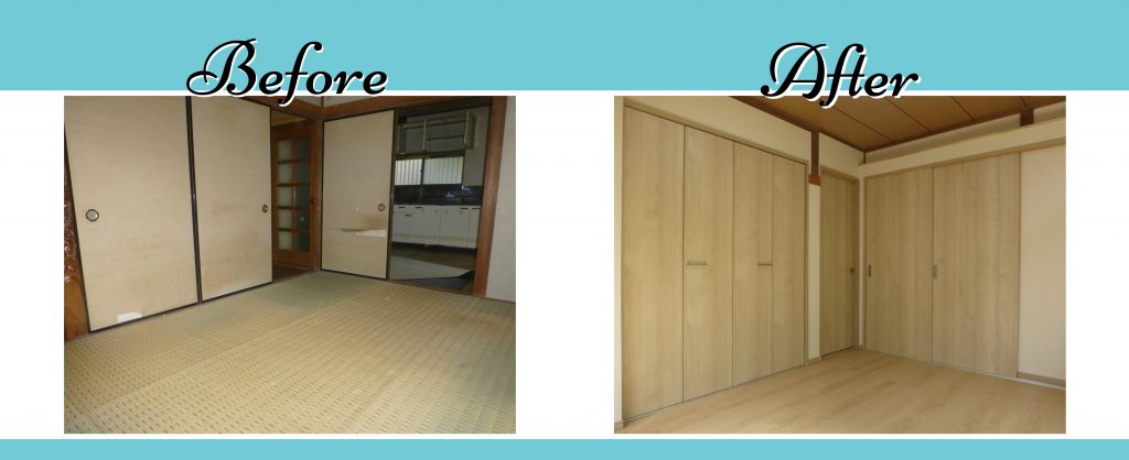 左のビフォアに新しい壁紙やフロア材を貼っても綺麗に仕上がります。
